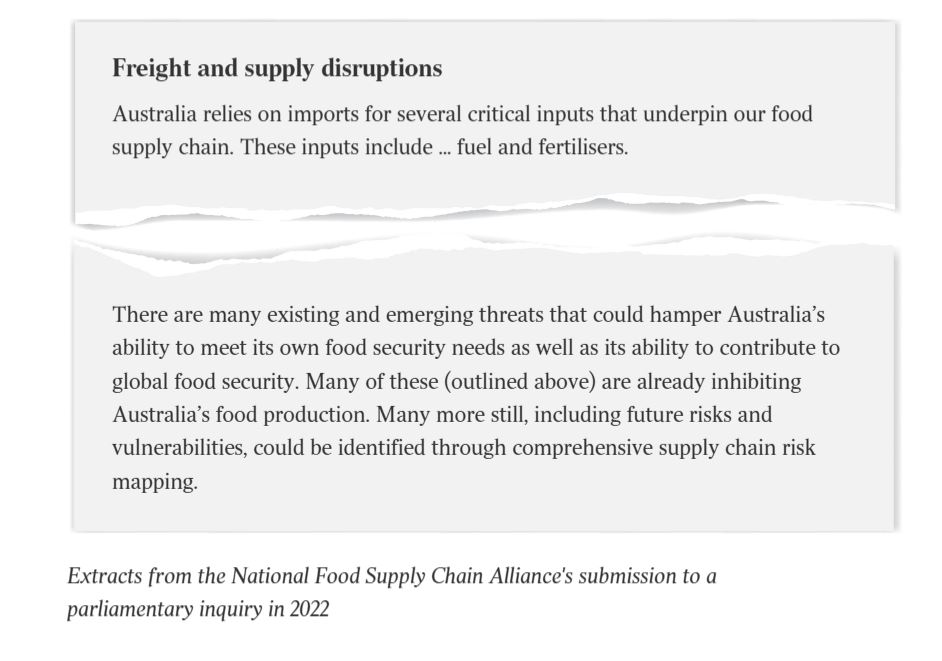 Food industry groups and experts told The Australian the current fuel and fertiliser crisis, triggered by the Iran war, exposed government failure to heed repeated warnings on the need for a food and fuel security plan since 2022.